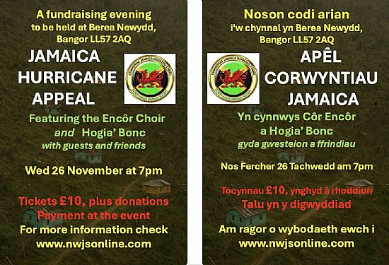 Thanks to Capel Berea Newydd and the wonderful choirs Encôr and Hogia’r Bonc (a spin-off from Côr y Penrhyn), plus our guest performers, we’re holding the first Bangor fundraising event for the Jamaica Hurricane Appeal at 7pm on Wednesday 26th November at Capel Berea Newydd, St David’s Drive, Penrhos Road, Bangor LL57 2AX.